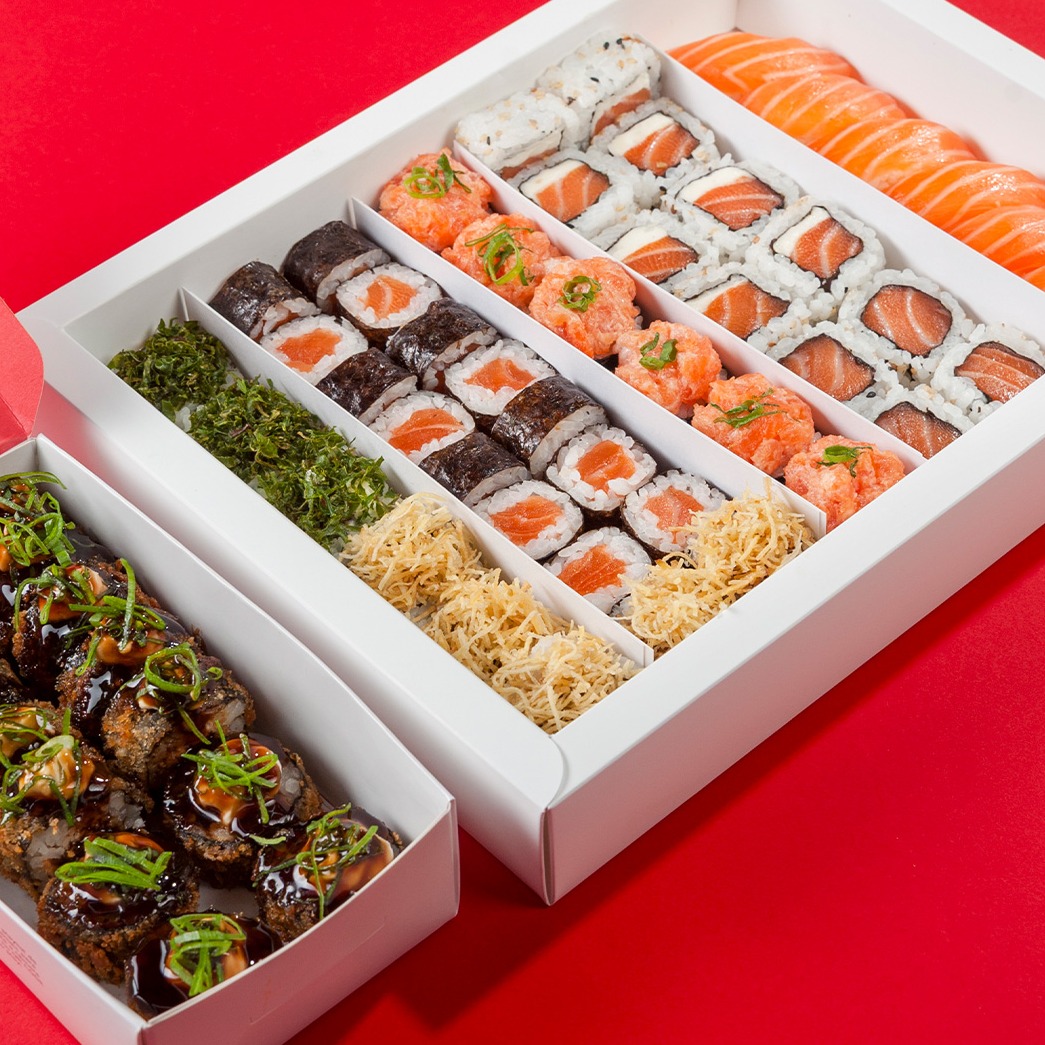 Serve 3 a 4 pessoas ❤ 8 uramaki filadélfia, 6 niguiri de salmão, 6 castelinho, 14 shake maki, 14 hot roll, 3 uramaki skin filadélfia com crispy de couve, 3 uramaki skin filadélfia com crispy de batata doce 4 uramaki salmão, 2 hossomaki patê de salmão com crispy de batata doce. Contém 2 potes de shoyu, 3 hashi, wasabi, gengibre e, sobretudo, amor ❤ (Cortesia - selecione em ACOMPANHAMENTOS os itens desejados)